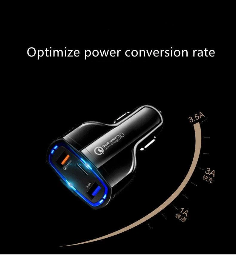3 USB Ports Fast Car Charger QC 3.0, 100% Fast Qualcomm car charger Type C Port and 2 USB Ports, New With Box