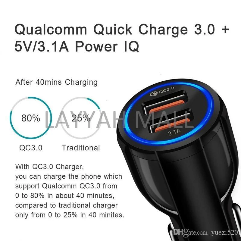 Fast Charging Slots 2 ports of 3.0 or 3.1 QC Quick Dual Car Charger Adapter 3.1A Auto Phone Charger