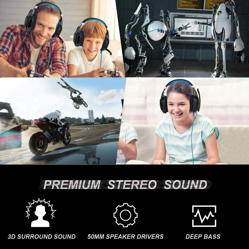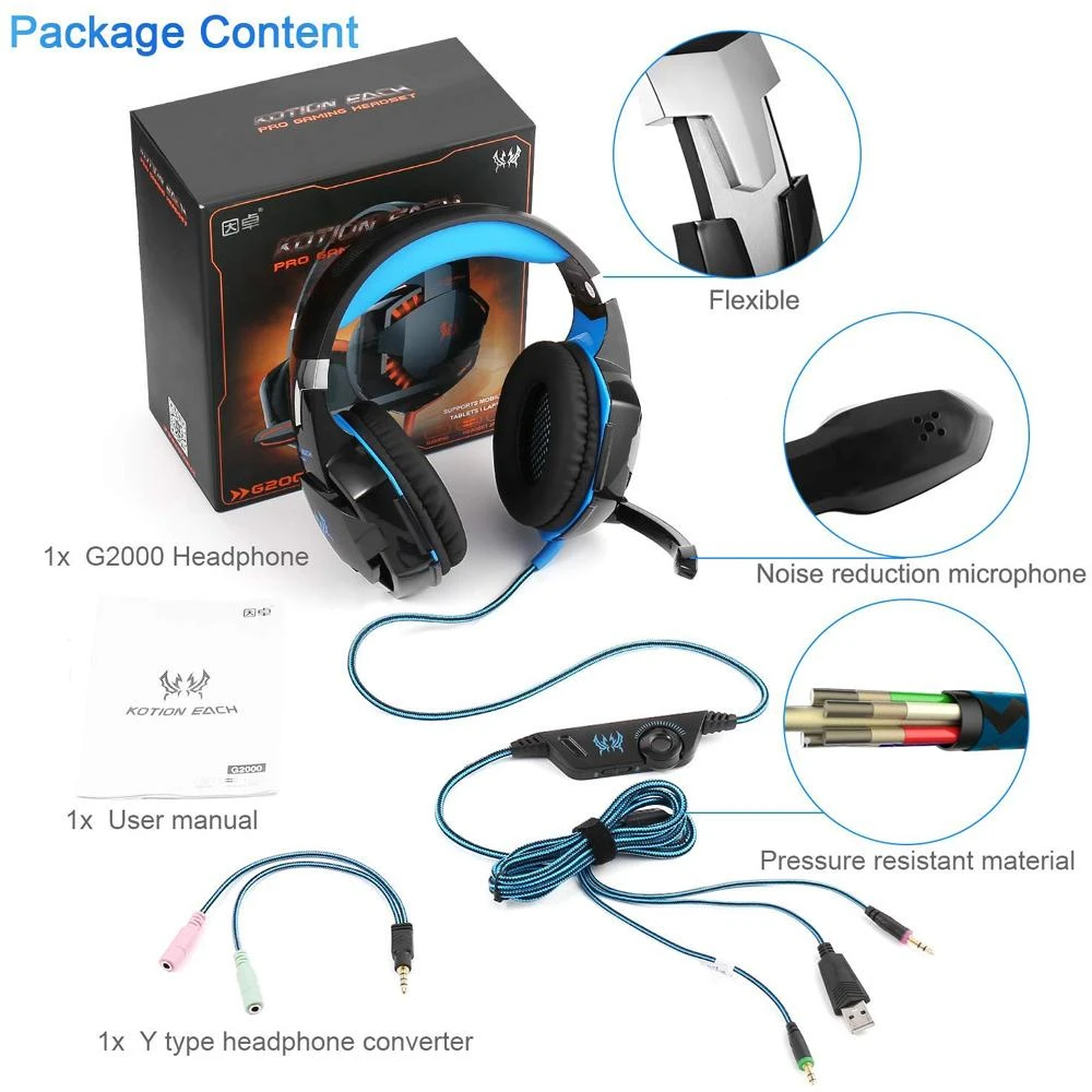 Whatβs in the box 1*Kotion Each G2000 Gaming Headset Surround Sound Stereo Headphone with Noise Isolation Microphone In-Line Control for PC PS4 Xbox One – Blue