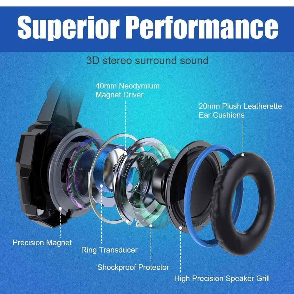 Kotion Each G9000 Stereo Gaming Headset for PS4, PC, Xbox One Controller, Noise Cancelling Over Ear Headphones with Mic, LED Light, Bass Surround, Soft Memory Earmuffs for Laptop – Blue