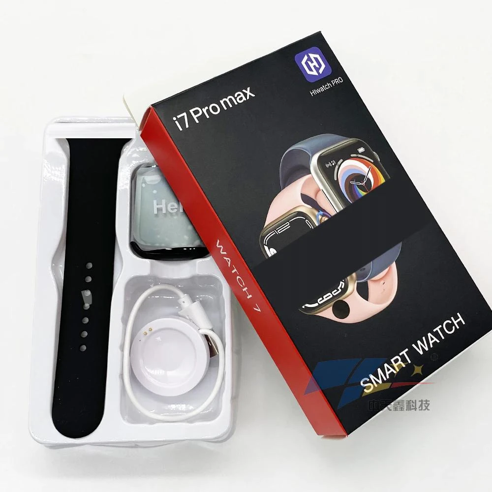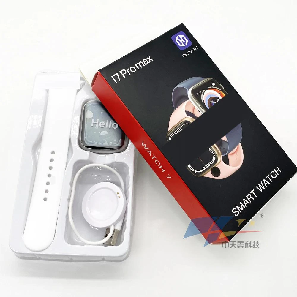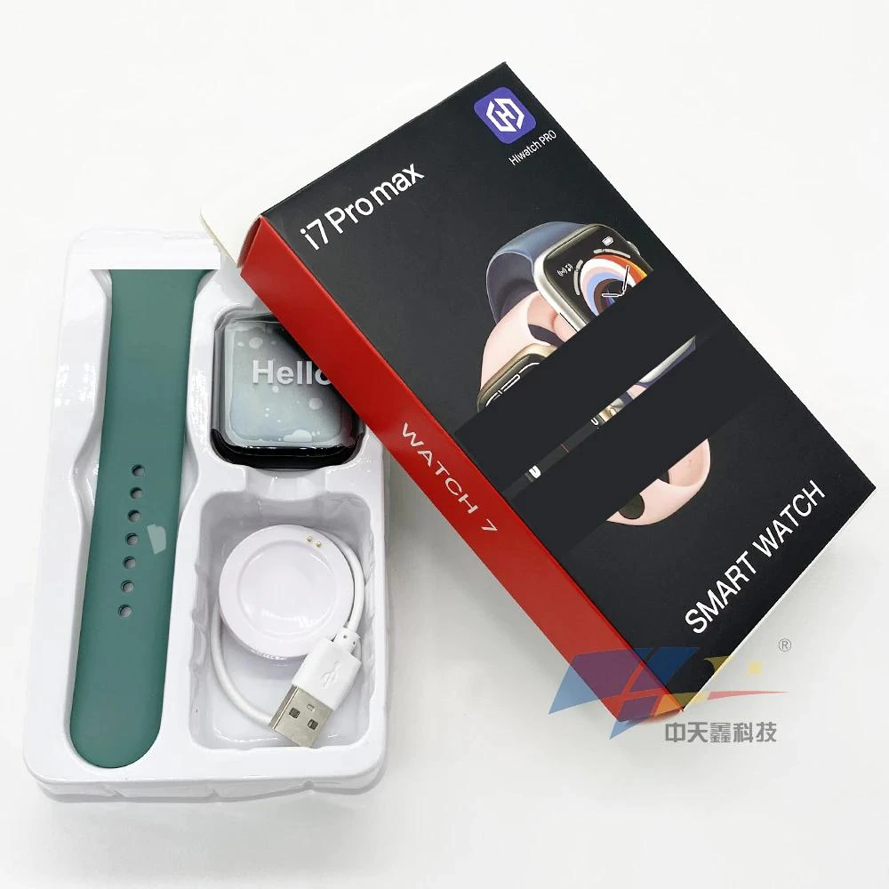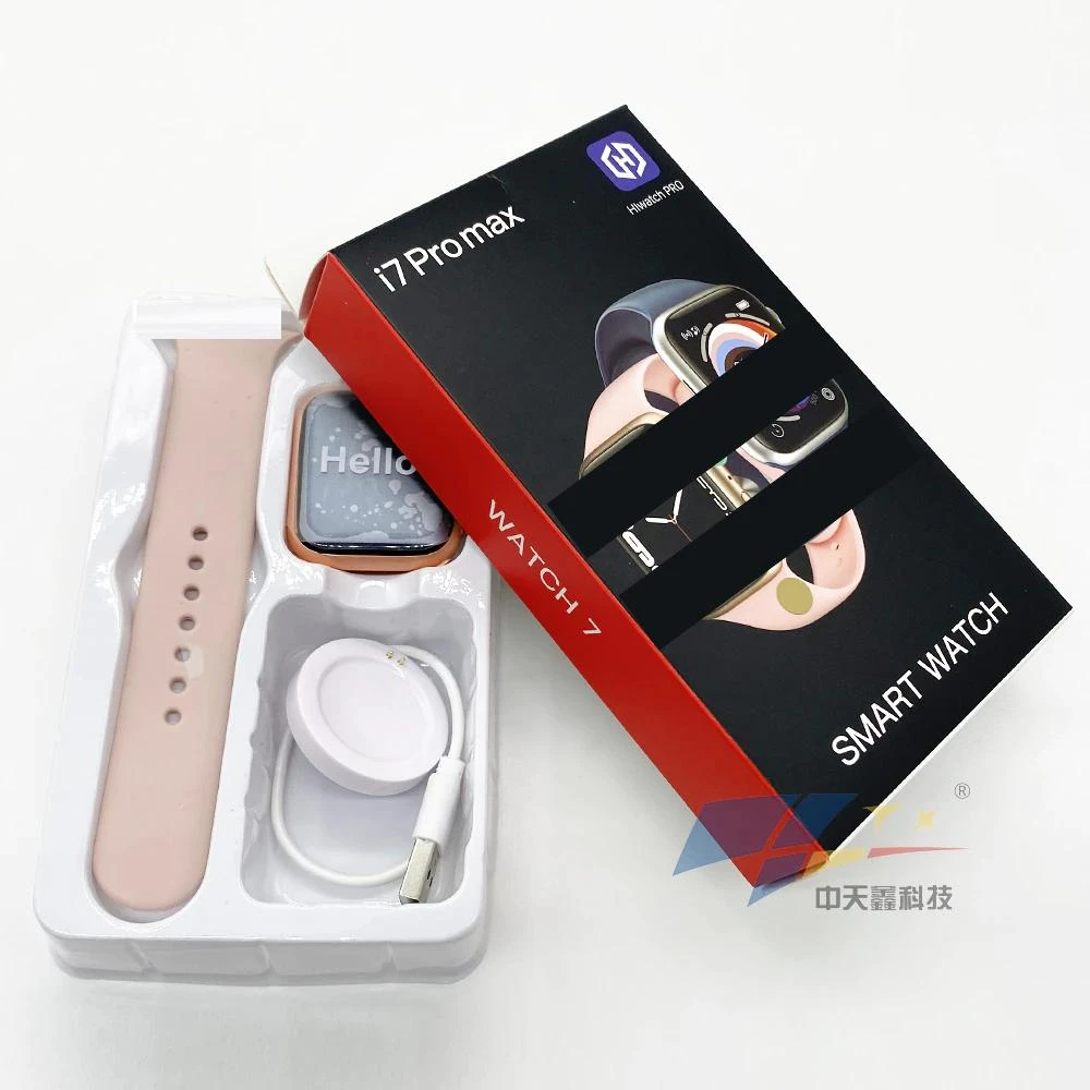 Original i7 Pro Max Smart Watch 7 Series 7 2022 New Smart Watch Latest Model For IOS & Android Specification:1. Watch size: 44mm2. Watch color: black, white,Pink3. Screen size: 1.77 inches4. Screen: HD IPS, 2.5D curved full touch screen, 320×385 resolution5. CPU: MTK25026. Memory: 256MB7. Battery: 220-300mAh lithium ion battery, longer battery life8. Strap size: 42/44mm9. System: Support Android5.0&IOS9.0 and above.12. Languages: English Dutch Russian French Portuguese German Spain Turkey Poland Malay Czechoslovakia Arabic Thai Italy13. IP67 life waterproof, please do not bring your watch to swimming, diving, bathing and sauna!14.Appearance material: alloyFunctions:1.Watch comes with GPS function2.Notification:Synchronous incoming messages notification from Notification Center in your phone(SMS,Fackbook,INS,Twitter,Whatsapp, etc.),incoming call reminder.3.Calls: Make & Answer calls, after connecting Bluetooth with Smart Phone4.Heart rate detection/Blood Pressure detection/Blood oxygen detection5.Sleep monitoring: To record and analyze your sleep status objectively and scientifically6.Steps: Steps counting, Calories, distance monitor7.SportModes.(running,climbing,football)8.Bluetooth music player: Remote control phone music player9.Bluetooth Camera: Remote control mobile phone to take photo10.Find Phone: Anti-lost, Ring your phone or watch11.custom watch face:you can upload your own photos on the watch as the watch faces.12.Support different kind of 42/44 strap exchange13.Sedentary reminder: Set time to reminder you to sport, changing the unhealthy lifestyle14.Other function: Alarm, Calculator,Stop,Intelligent voice,Phone book,weather.Packing list:smart watch*1charging cable*1user manual*1Packing box*1Note:1.The principle of smartwatch measurement is completely different from that of medical equipment. It is only for sports and fitness reference, thank you.2. After receiving the watch, it is recommended to charge the watch first.3.Please scan the QR code in the manual to download the APP before use