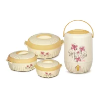 Bar BQ 4 Pc . This 4 piece set of plastic crockery consists: 1. A set of three insulated Hotpots(S,M,L),with push slide lid and one insulated 14-litre wide mouth water cooler with easy open double side locks.