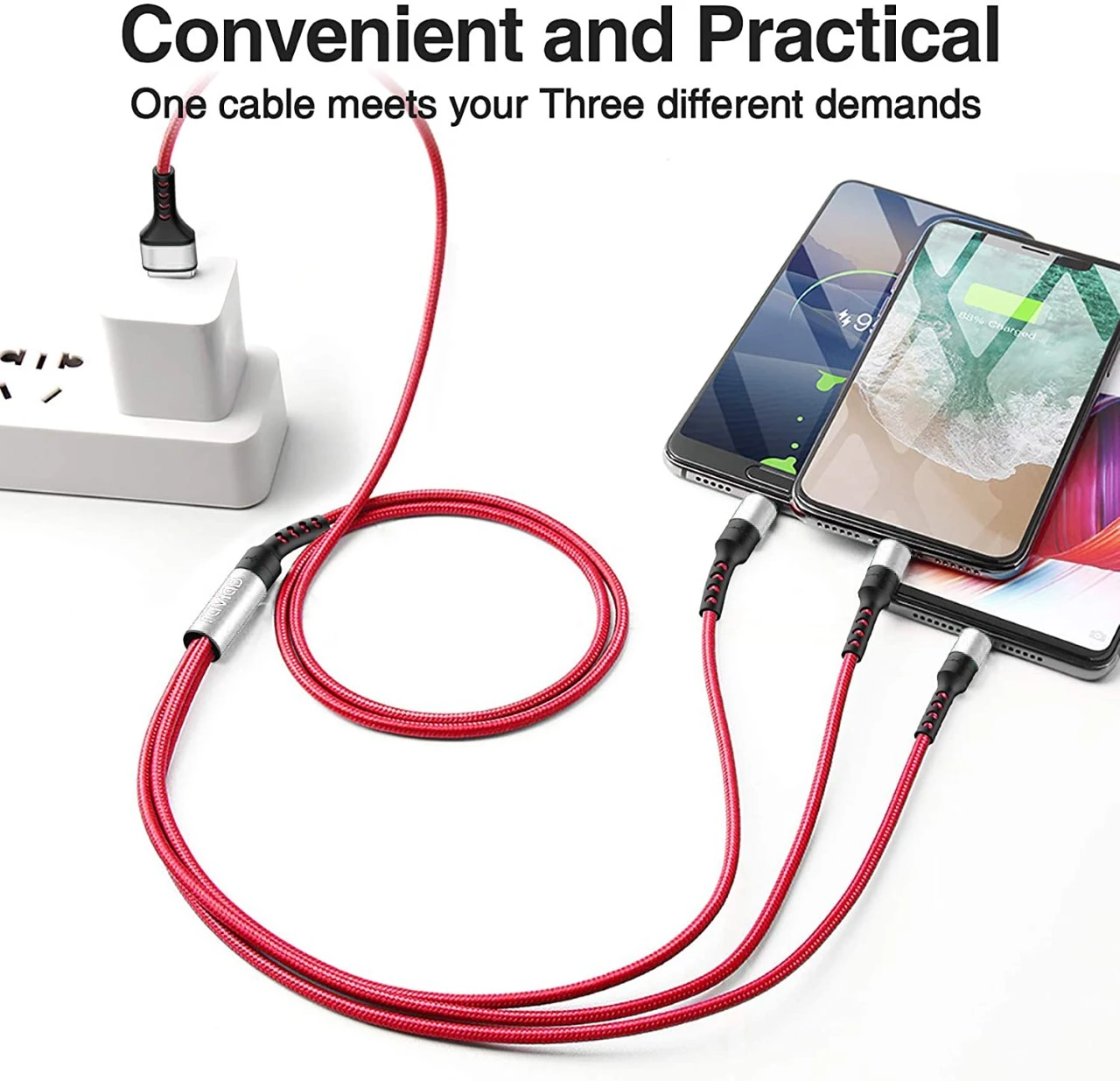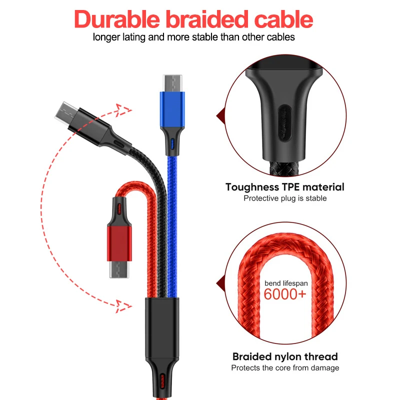 This 3 in 1 cable with Type-c, Lightning and micro USB connector will charge all android and iOS devices. All the heads of this cable can be used for fast charging and transferring data to your devices. It adopts the anti-oxidation copper wire material that can ensure a stable current and a safe charging environment. Just one charging cable, multi-purpose, makes your work and life more efficient, full of energy everyday.