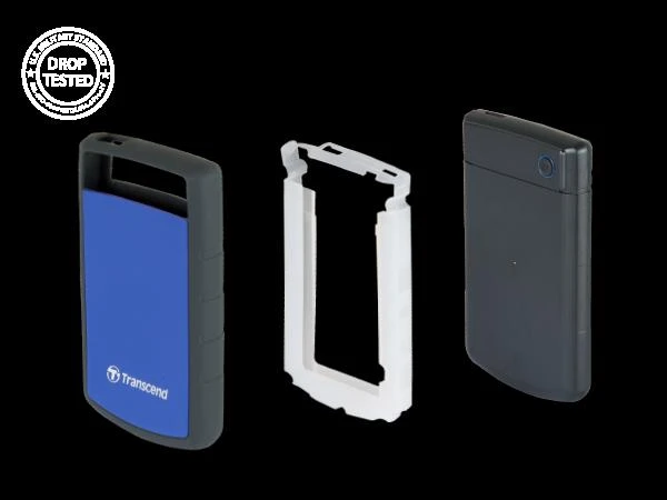 The StoreJet 25H3 features a three-stage shock protection system that meets US military drop-test standards to fully protect data stored on the drive. The three-stage shock protection system includes a silicone rubber case, an internal shock-absorbing suspension damper, and a reinforced hard casing.