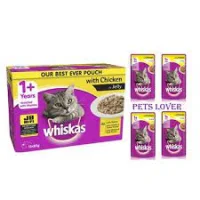 Whiskas Cat Food Jelly, Chicken Flavor, 85 g 100% complete & balanced diet. At WHISKASยฎ we understand what your cat naturally needs and loves. That’s why every pouch is nutritionally complete and balanced, with succulent meat pieces, to help you provide the best possible care for your cat.